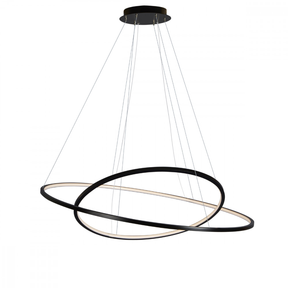 Lampada a sospensione LED con due anelli basculanti su cavi in acciaio. I due anelli sono realizzati in alluminio verniciato nei colori bianco opaco, nero opaco, grigio opaco o oro opaco, e contengono all'interno strip led ad alte prestazioni coperte da policarbonato satinato in grado di diffondere la luce in modo omogeneo creando una linea continua di luce.