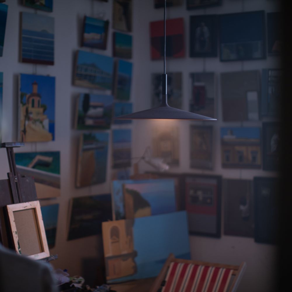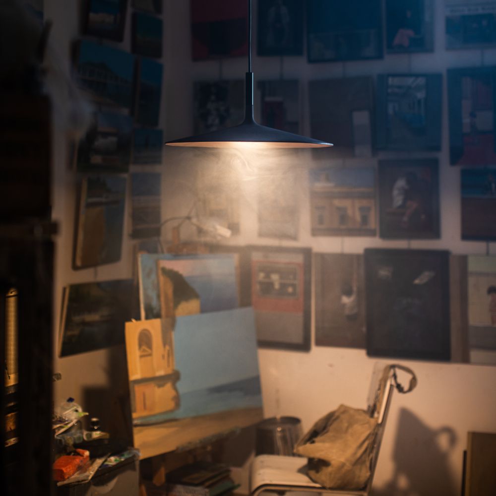 Aplomb Large è la versione maggiore delle sospensioni Aplomb, con ben 45 cm può essere installata da sola o in composizioni multiple. Ideale come lampada sopra tavolo.