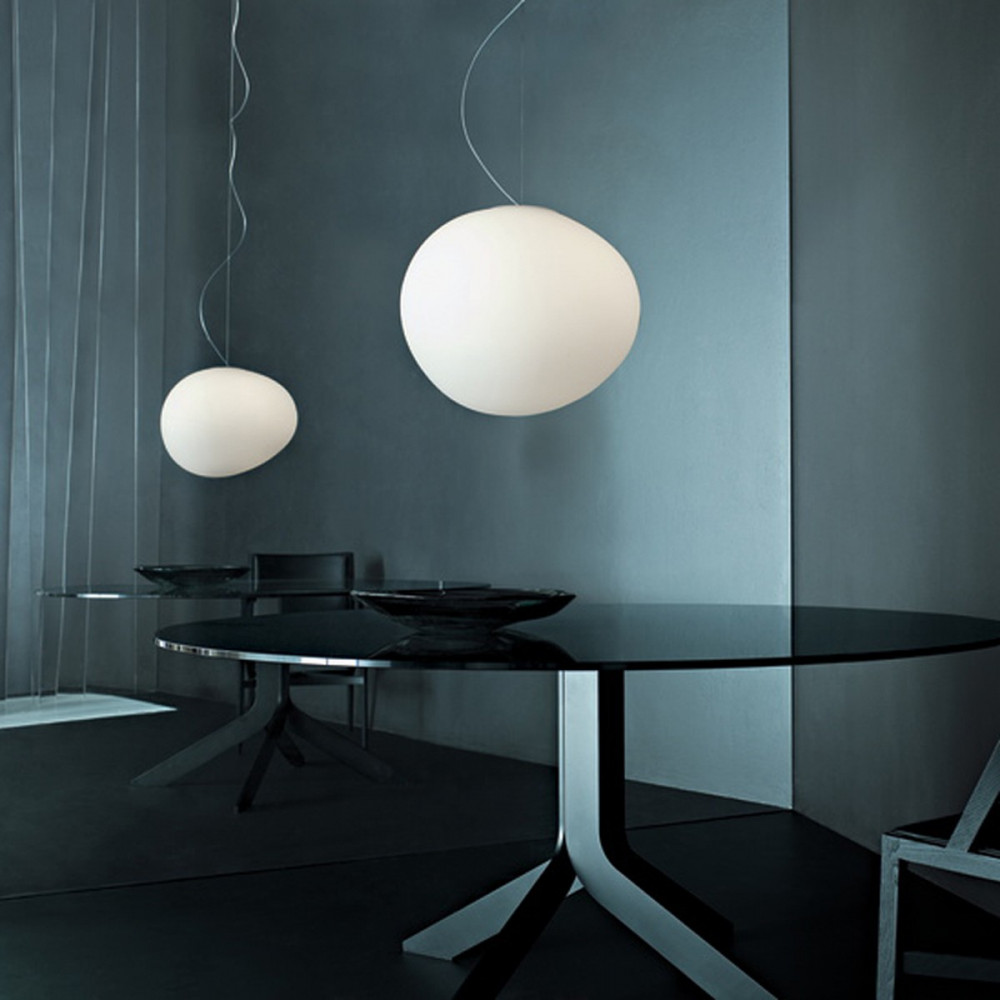 Frutto di ispirazione naturale e di approfondita ricerca, la forma di Gregg ricorda un grande ciottolo levigato dall’acqua, oppure l’uovo di un animale mitologico, simbolo di creazione e rigenerazione. Un volume puro e familiare nella sua facilità di lettura, eppure sorprendente, perché la forma asimmetrica di Gregg cambia immagine a seconda del punto di vista di chi la osserva. Una soluzione inedita per declinare un materiale tradizionale come il vetro soffiato diventa così uno strumento per conferire all’ambiente un carattere originale. Tre diverse dimensioni nelle versioni a sospensione, da tavolo, a soffitto e a parete e quattro soluzioni diverse per la versione da terra: la collezione Gregg è in assoluto fra le più versatili e trasversali, inserendosi con facilità in ogni tipo di contesto. In ambito domestico la luce calda e uniforme irradiata dal diffusore satinato bianco e lo stile essenziale hanno un forte valore funzionale e arredativo. La schermatura della lampadina in ogni direzione – grazie alla forma chiusa del diffusore – protegge dall’abbaglio e la rende di facile inserimento anche su altezze diverse. Utilizzata in composizione Gregg si offre agli impieghi più sorprendenti: una struttura “a pioggia” accentua l’estensione verticale di una vetrata o di un vano scale, con un effetto di grande impatto scenografico; lo sviluppo in senso longitudinale di una molteplicità di sospensioni a varie altezze genera spettacolari contro-soffitti luminosi; il volume reiterato lungo una linea introduce nuove prospettive, fino ad arrivare ad un “trompe l’oeil” luminoso.
