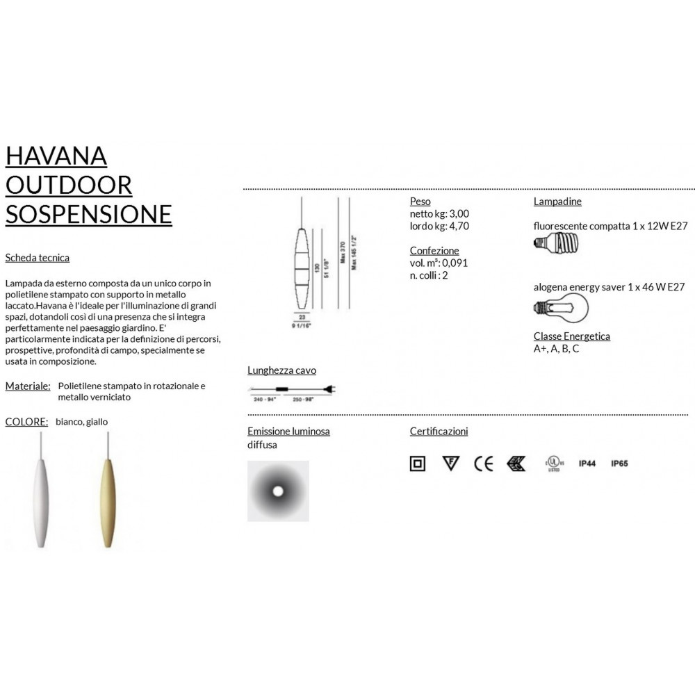 Il segno giovane e leggero che ricorda la forma di un sigaro, da cui ironicamente prende il nome, la luce morbida che emana e la facilità con cui si adatta a svariati contesti, l’hanno resa un modello di grande successo, inserita anche nella collezione permanente del MoMA di New York. La versione outdoor di Havana è composta da un unico corpo in polietilene con dei segni che ricordano la suddivisione in quattro segmenti che caratterizza il design del modello da interni. Nei colori bianco o giallo crema, Havana da esterno è disponibile a sospensione o da terra in due diverse altezze.