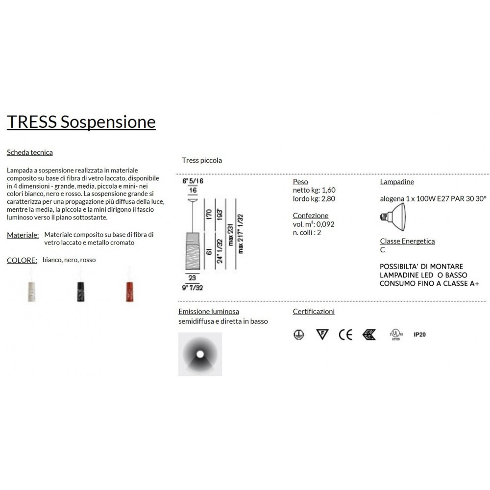 FOSCARINI TRESS SOSPENSIONE PICCOLA Lampada a sospensione realizzata in materiale composito su base di fibra di vetro laccato, disponibile in 4 dimensioni - grande, media, piccola e mini- nei colori bianco, nero e rosso. La sospensione grande si caratterizza per una propagazione più diffusa della luce, mentre la media, la piccola e la mini dirigono il fascio luminoso verso il piano sottostante.