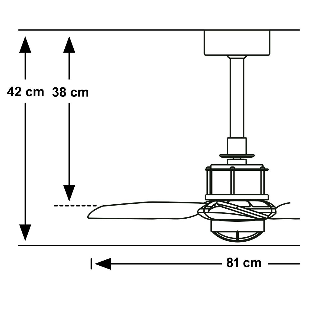 Ventilatore da soffitto con luce in stile industriale e moderno, diametro 81 cm, ideale per ambienti fino a 13 m2. Motore DC silenzioso e a basso consumo. 6 velocità e inversione della rotazione. Luce LED 11W 3000K 709 lm. Disponibile nei colori nero, nero/noce e Oro vecchio/Noce. Telecomando in dotazione.