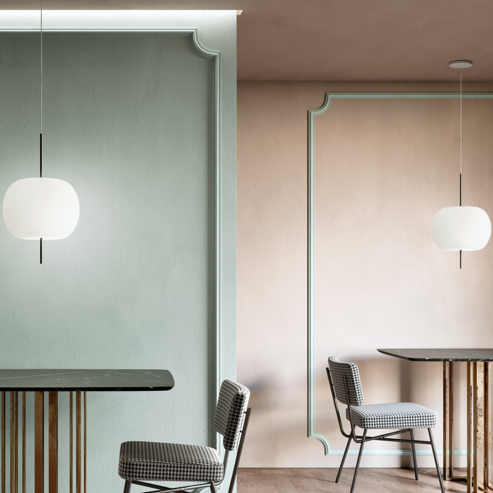La sua luce calda e soffusa galleggia leggera nello spazio, un invito elegante al convivio negli spazi contract e della casa.