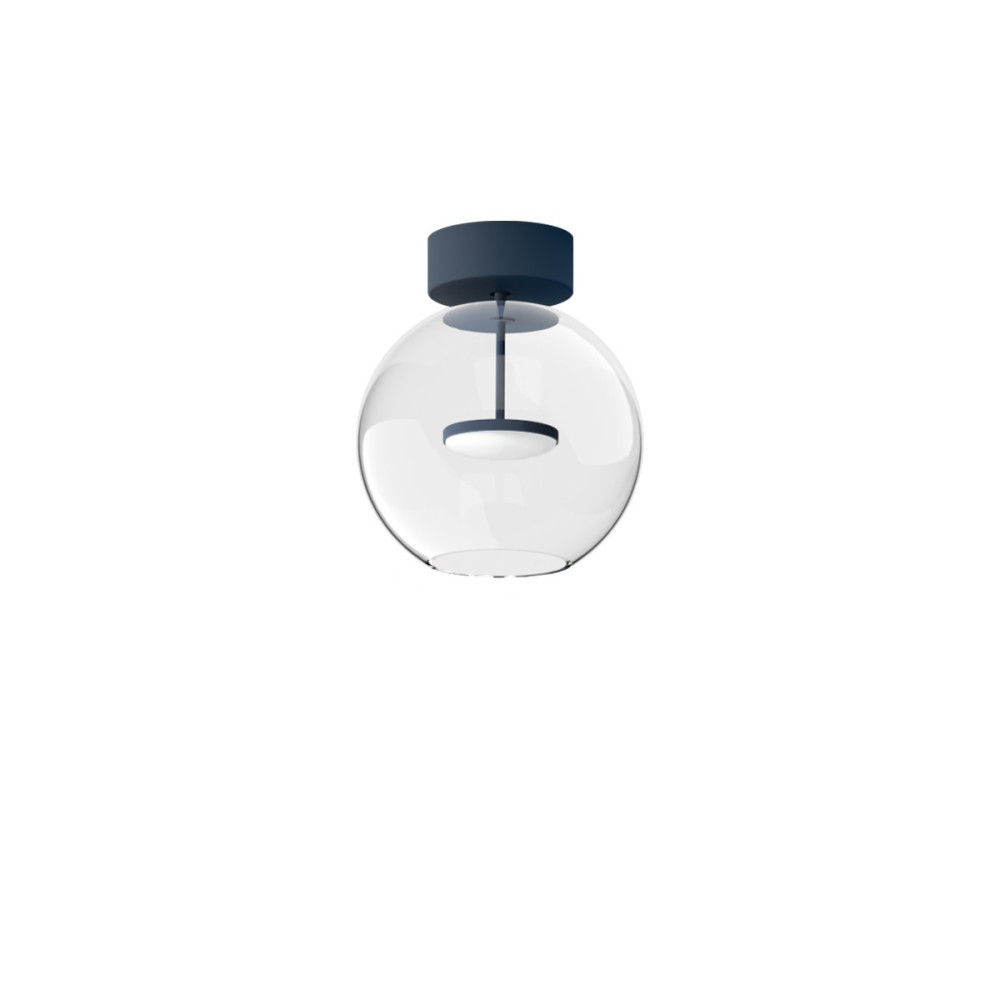 Lampada a soffitto con diffusore in vetro d. 24 cm, montatura in alluminio, disponibili nei colori bianco, nero, peach, petrol e deep blue. LED 11W fino a 1186 lumen, CRI 90, 2700K o 3000K, dimmerabile.