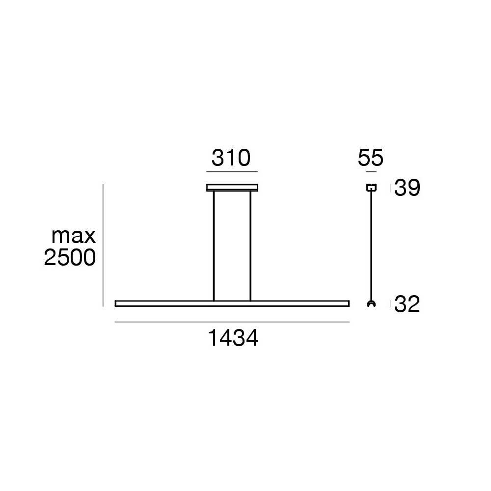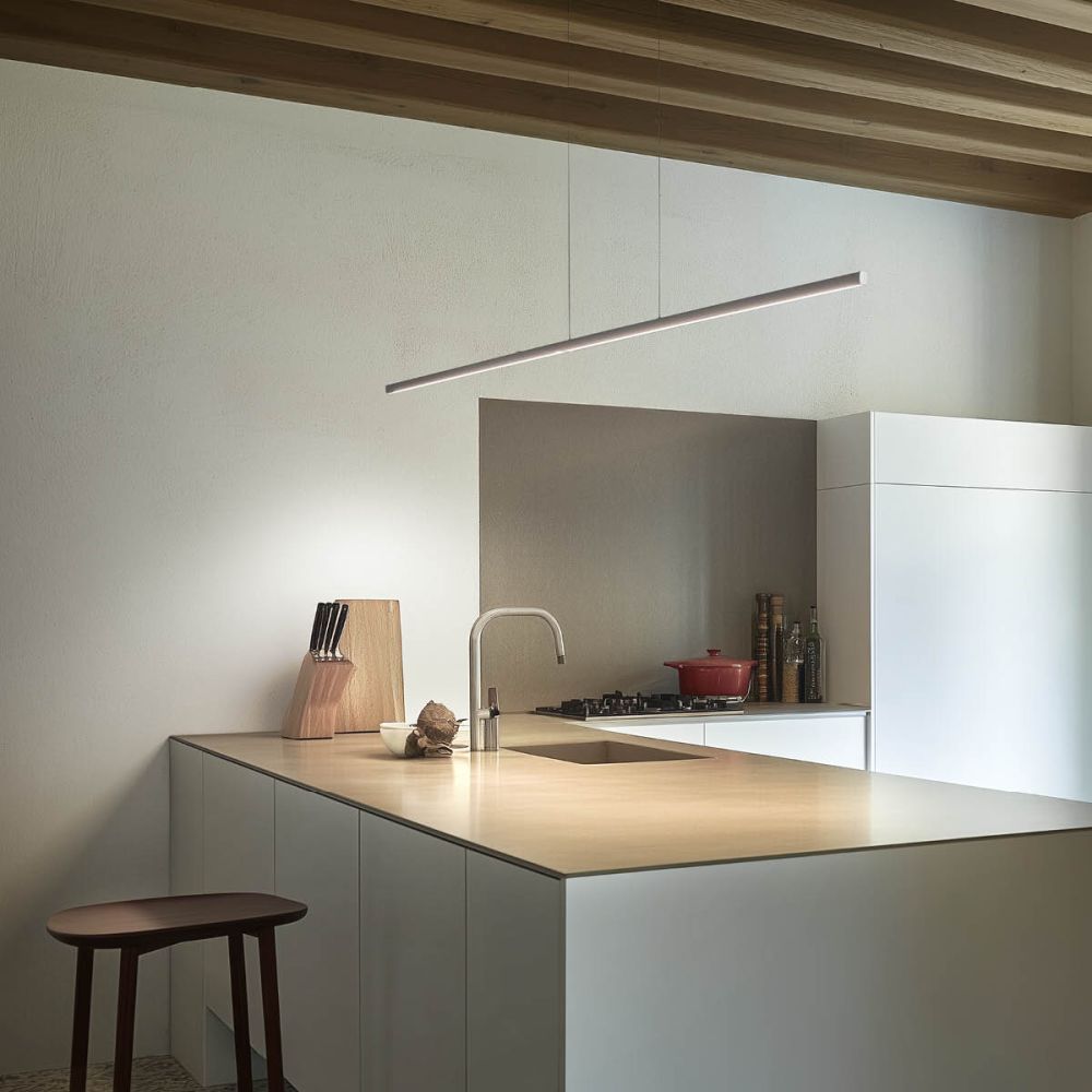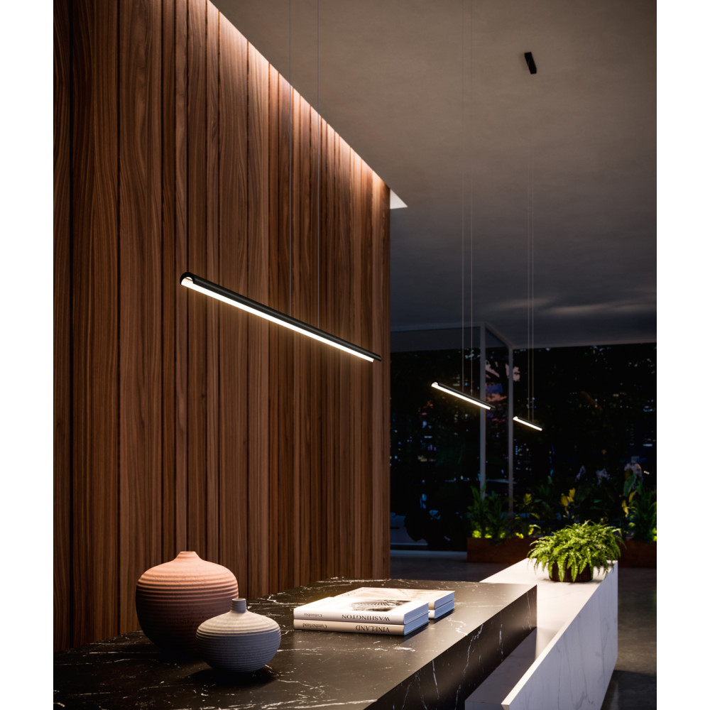 Lampada a sospensione lineare caratterizzata da una forma cilindrica scavata. Lunghezza 143 cm. Corpo in alluminio lucido, bianco o nero. Dimmerabile con dimmer a taglio di fase. LED 42W 3000K 2539 Lumen.