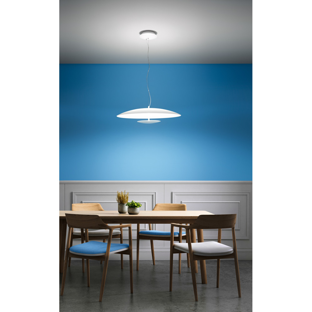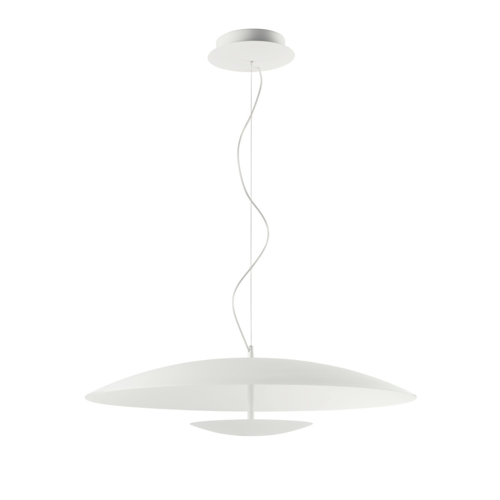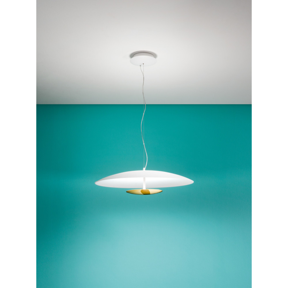 Sospensione da interno Ø 65 cm, LED 34W, 3000K, CRI 90, 2270 lumen. Emissione diffusa e indiretta per un’illuminazione morbida e uniforme. Luce dimmerabile a taglio di fase. Struttura in metallo verniciato con diffusore in vetro opalino, disponibile in finiture bianco, oro o cromo.