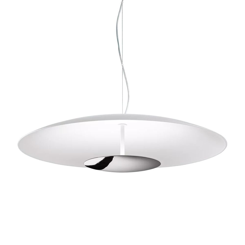 Disco volante a luce riflessa e diffusa, il bianco del diffusore espande la luce indiretta e la propaga sul piano senza dispersioni. A sospensione o a plafone dal forte impatto scenografico. Materiali: montatura in acciaio bianco, oro o cromo raggrinzante, diffusore in vetro serigrafato/sabbiato.