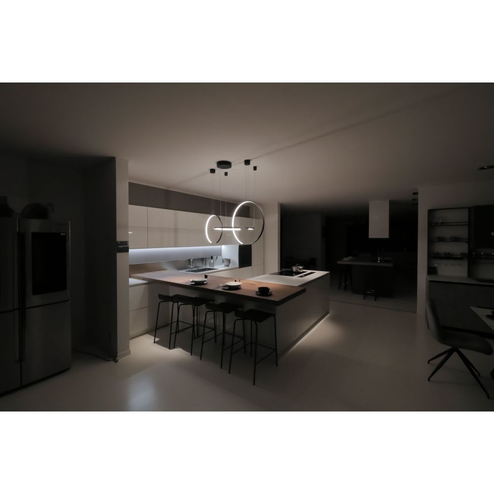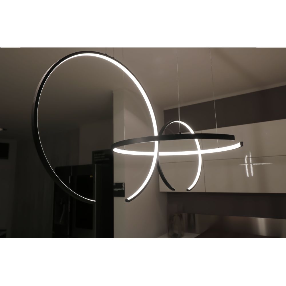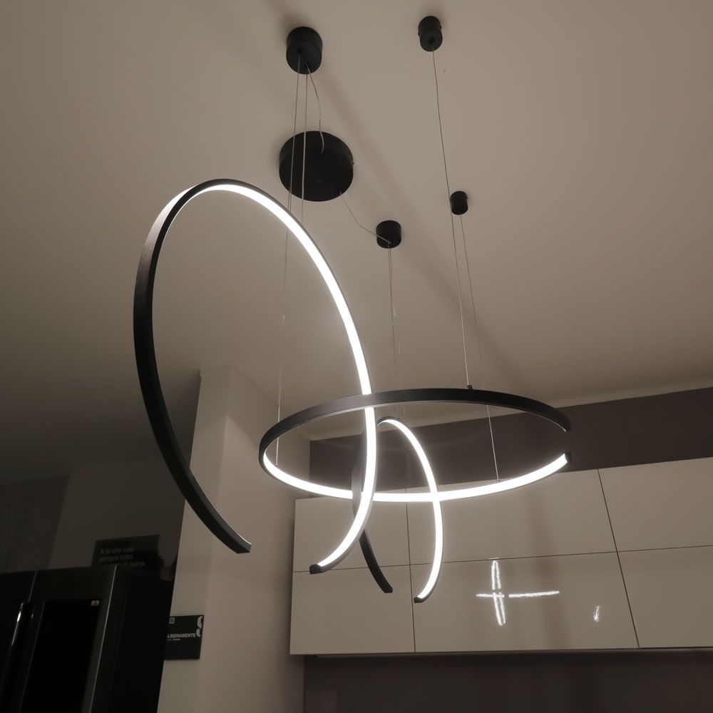 Lampada LED scenografica con tre anelli sospesi e intersecati, LED 80W con selettore colore luce 3000K o 4000K. Disponibile in colore bianco o nero. Una sospensione di design di grande impatto che valorizza ogni ambiente.