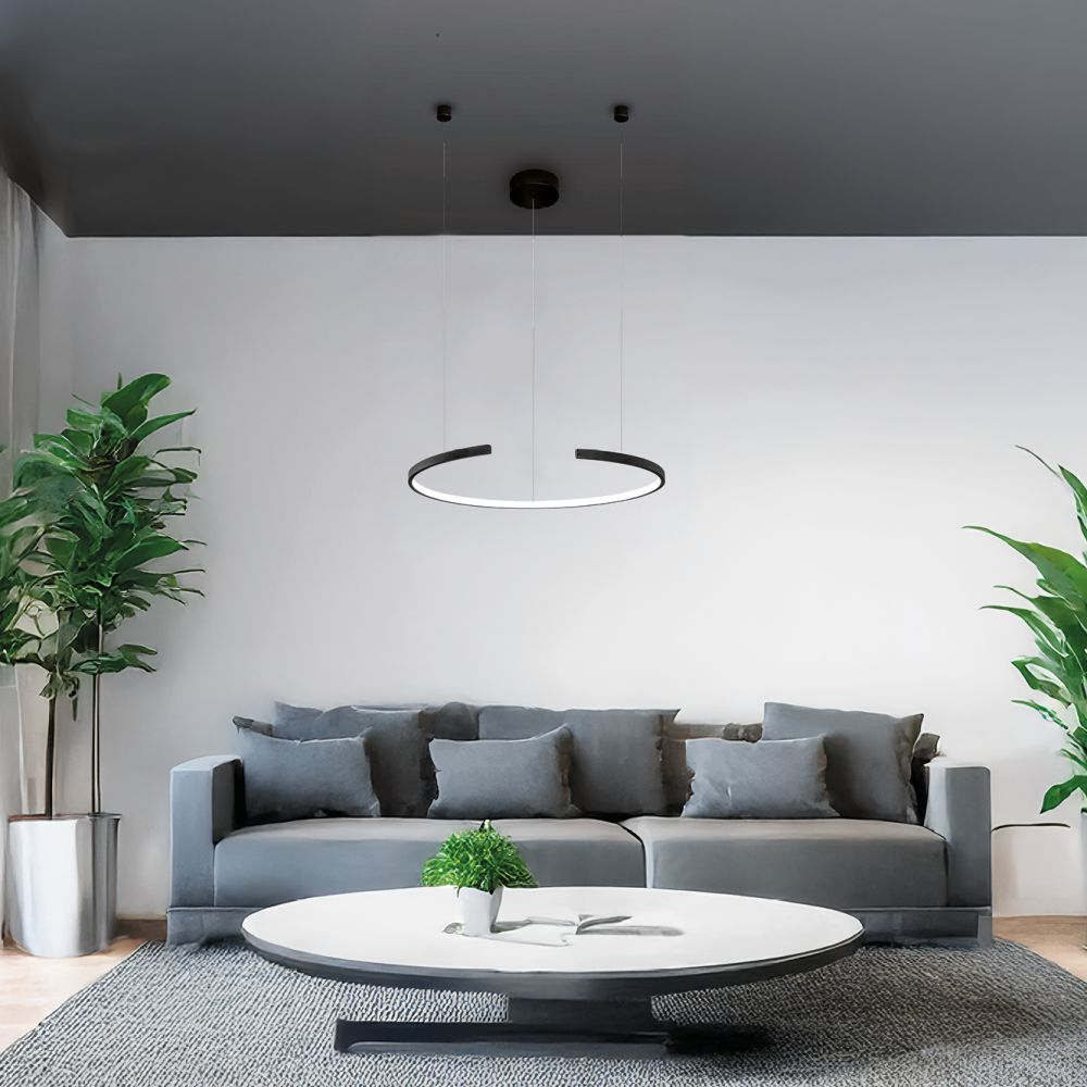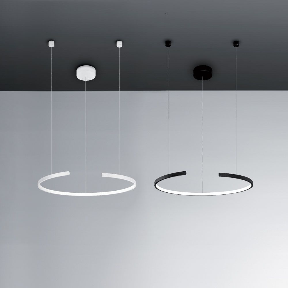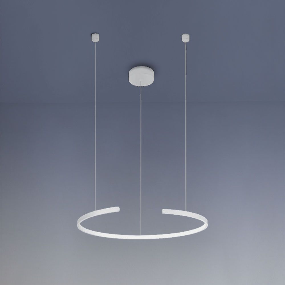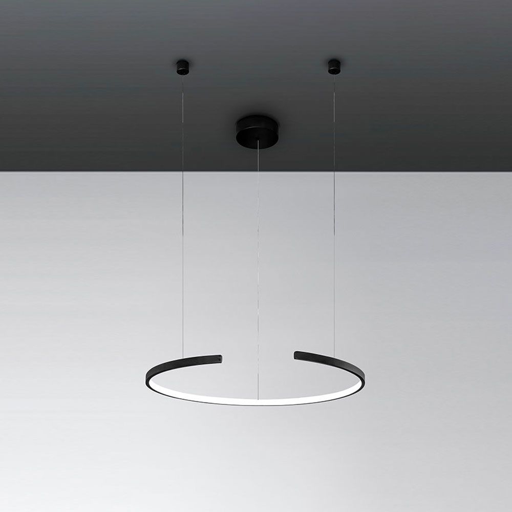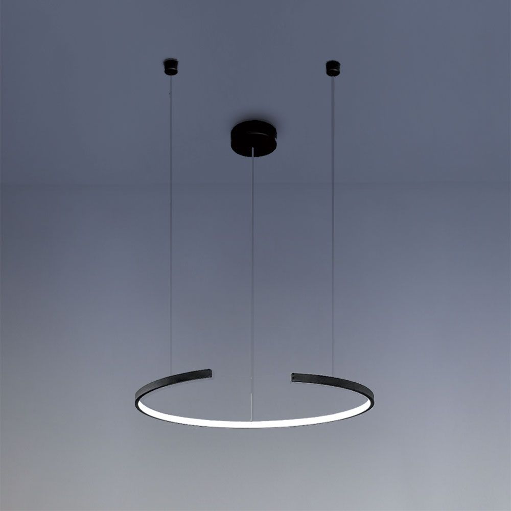 Realizzata in acciaio, con un anello aperto di diametro 60 cm e cavo regolabile fino a 210 cm, luce LED 30W con selettore tonalità 3000/4000K e flusso luminoso 1540 - 1610 lm.