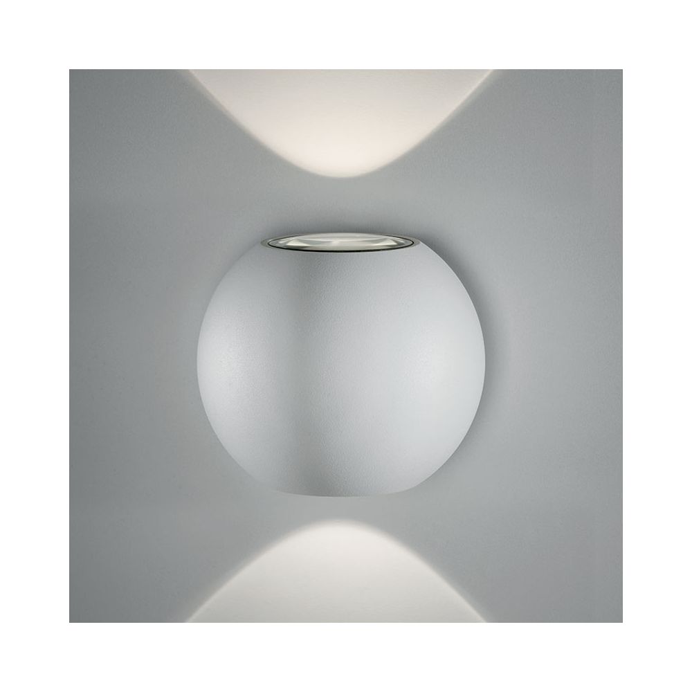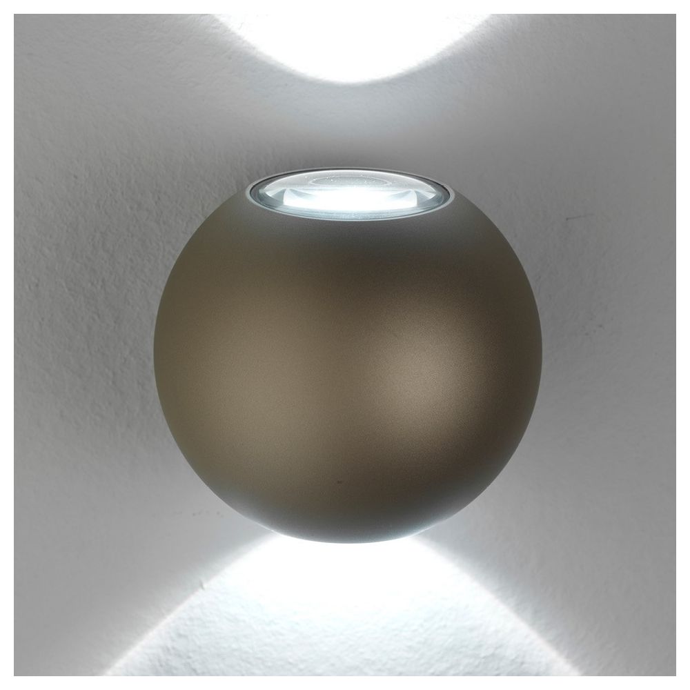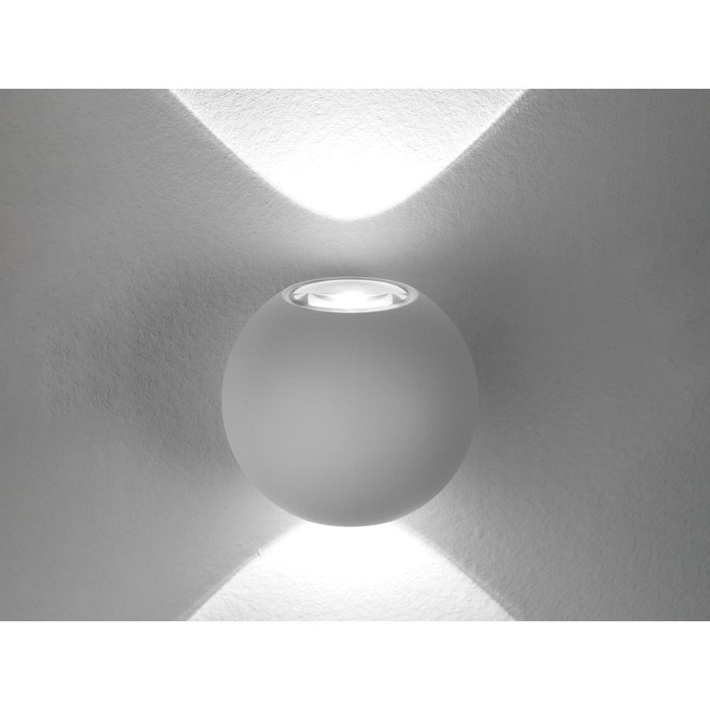 Applique moderna sferica, biemissione, LED 2x3W, disponibile nei colori bianco e sabbia. Con selettore colore luce 3000K/4000K. Dimmerabile con dimmer a taglio di fase.