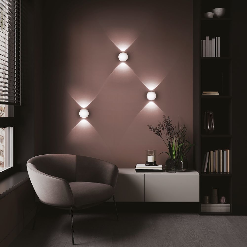 Sky Fall Applique è una lampada da parete biemissione dal design sferico, elegante e minimalista.
