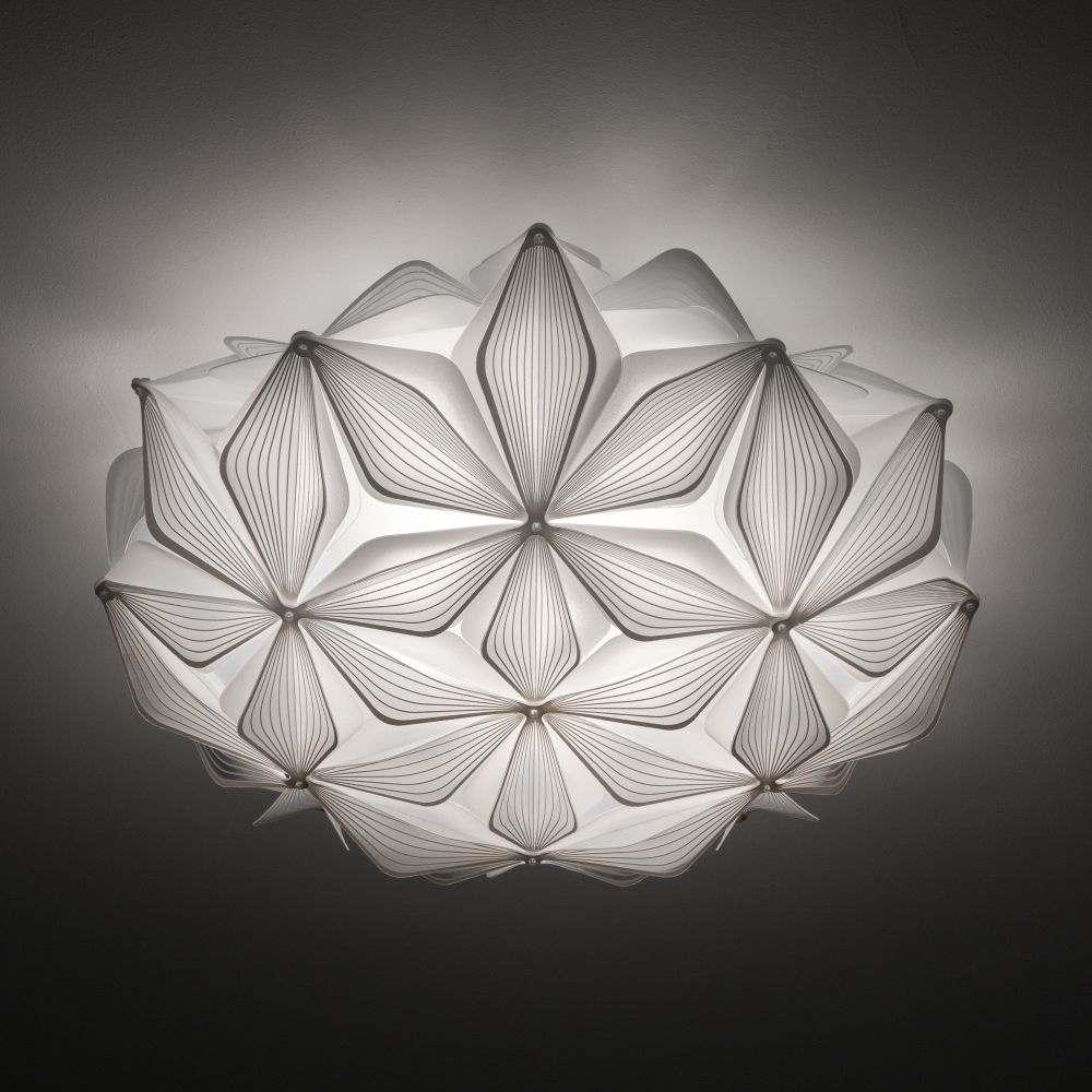 C'est La Vie Plafoniera/Applique Medium d. 50 cm, di Adriano Rachele per Slamp, è la versione misura più versatile della collezione C’est La Vie! per installazione a soffitto o parete. Le dimensioni equilibrate permettono di utilizzarla come luce principale, capace di riempire lo spazio con una luminosità morbida e uniforme.