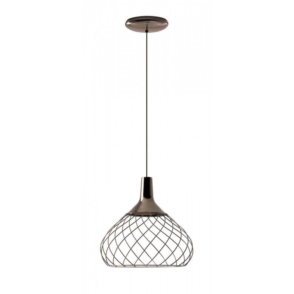 Lampada a sospensione LED di diametro 40 cm con una struttura organica che si avviluppa su sé stessa, fino ad assumere i contorni di una forma circolare affusolata. È disponibile in metallo verniciato nero oppure con finitura oro rosa e nickel nero.