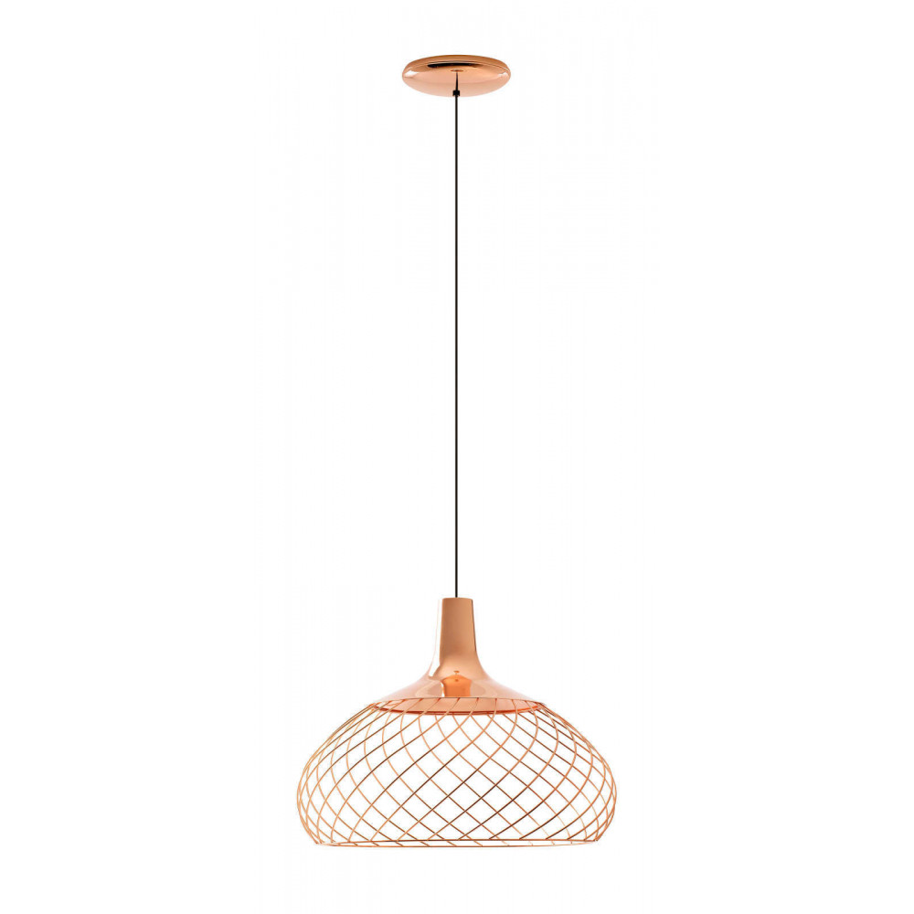 Lampada a sospensione LED di diametro 57 cm con una struttura organica che si avviluppa su sé stessa, fino ad assumere i contorni di una forma circolare affusolata. È disponibile in metallo verniciato nero oppure con finitura oro rosa e nickel nero.