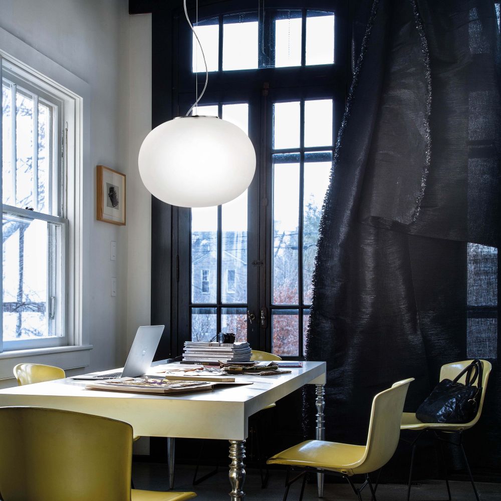 Una delle più versatili collezioni. La sua forma ovale in vetro soffiato satinato è disponibile in diverse dimensioni, che si prestano a innumerevoli combinazioni d'installazione.
