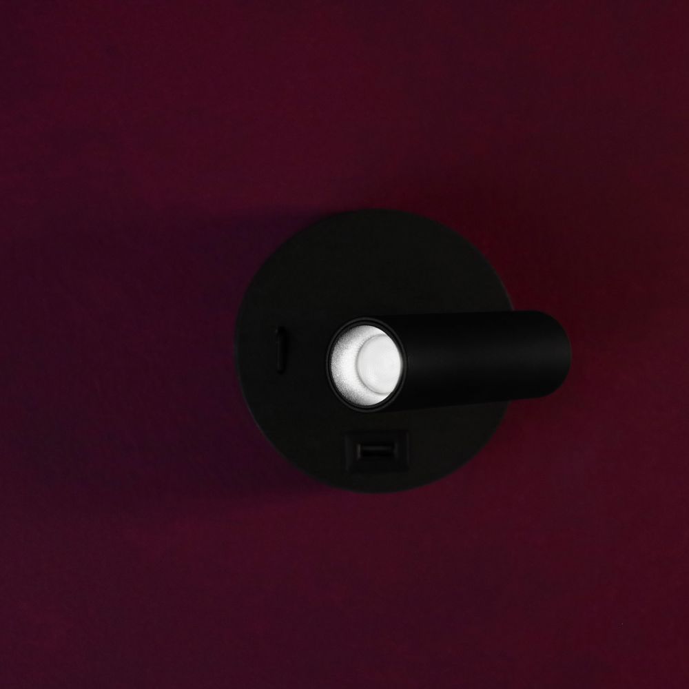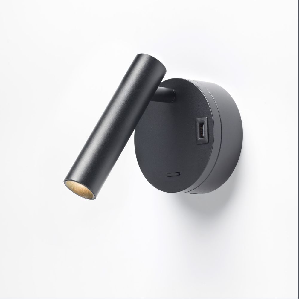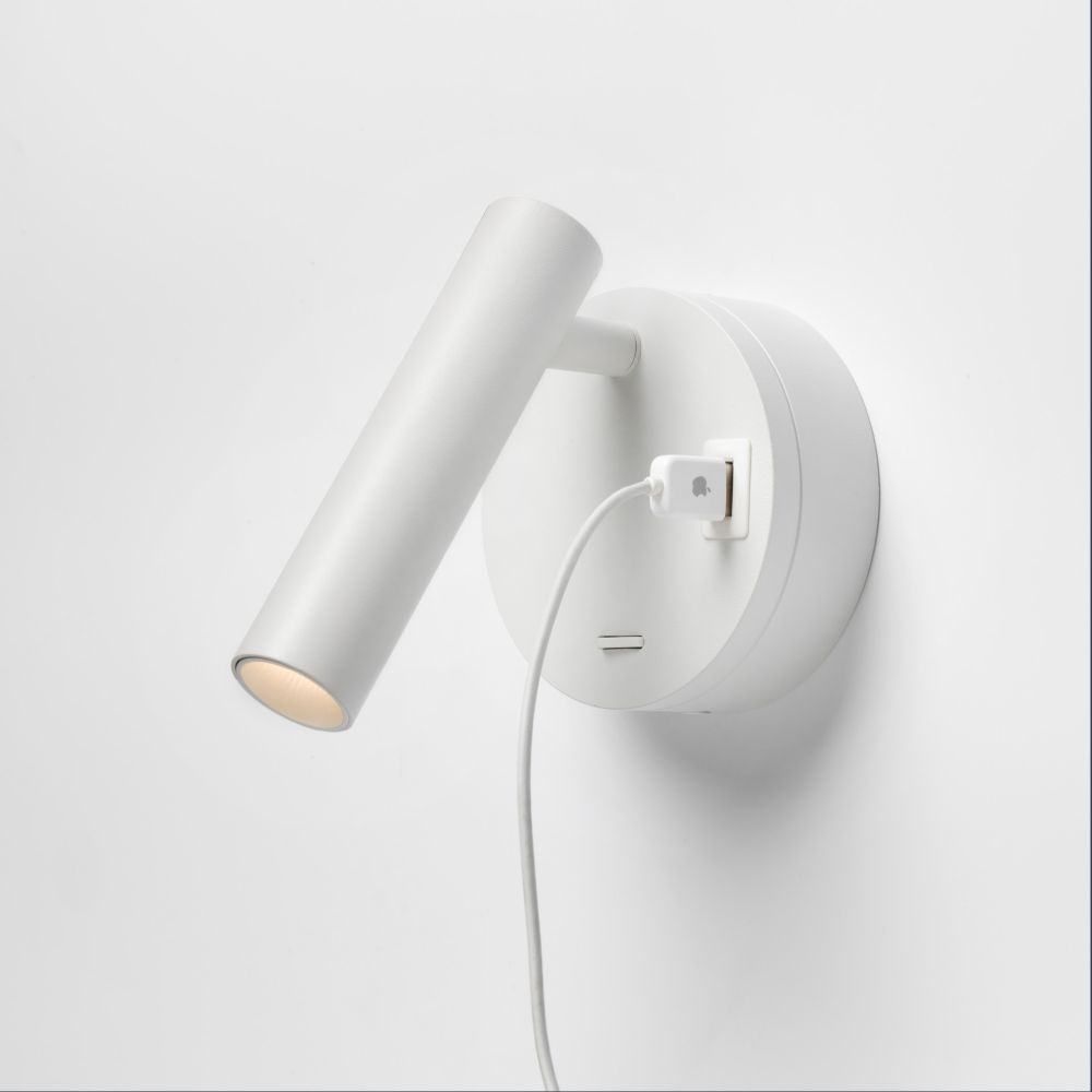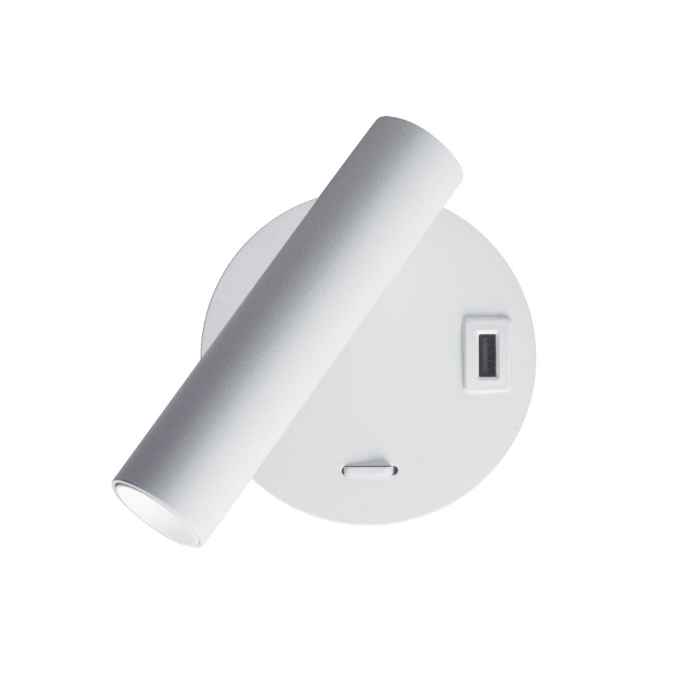 Applique moderna orientabile in alluminio con LED integrato da 2W, ideale come luce da lettura in camera. Dotata di interruttore e presa USB A e interruttore sulla base.