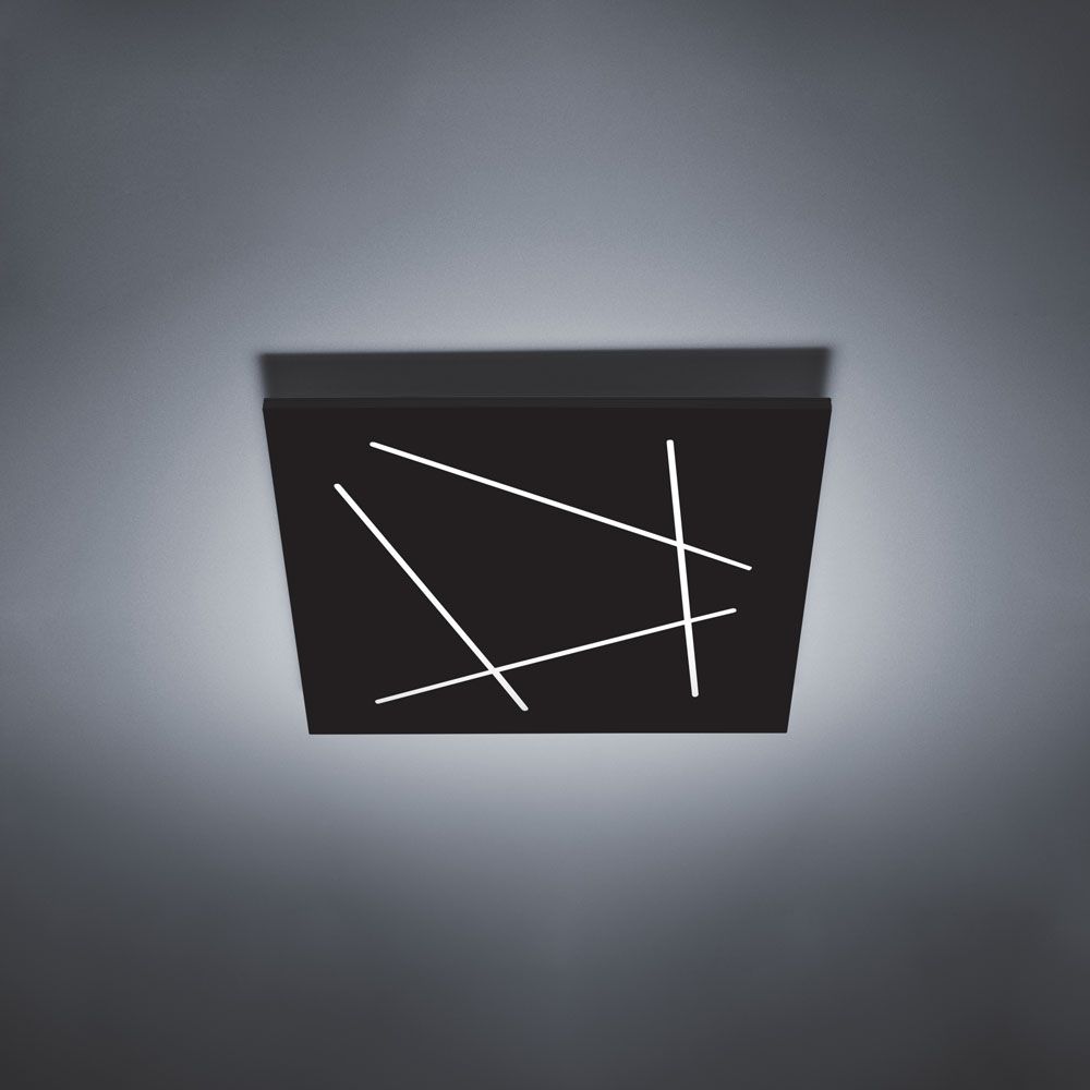 Plafoniera-Applique quadrata moderna, 45x45 cm, realizzata in alluminio, emissione luce attraverso segni lineari incrociati. LED 42W disponibile 3000K o 4000K, nei colori bianco, nero e sabbia. Ideale per interni, dal design minimale con linee geometriche luminose.