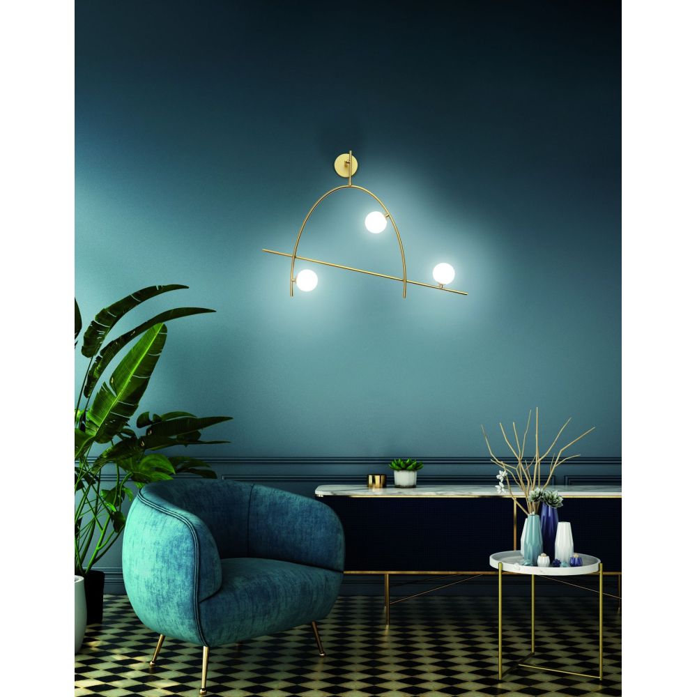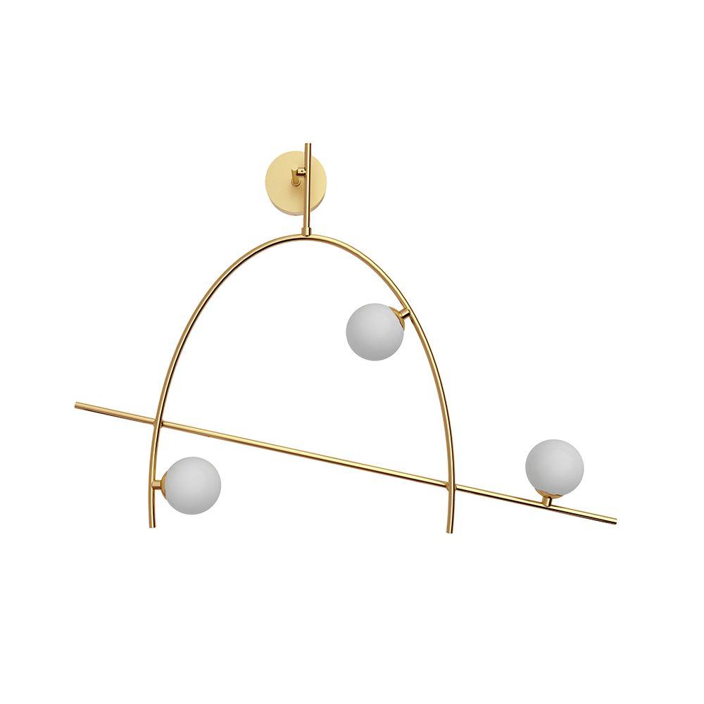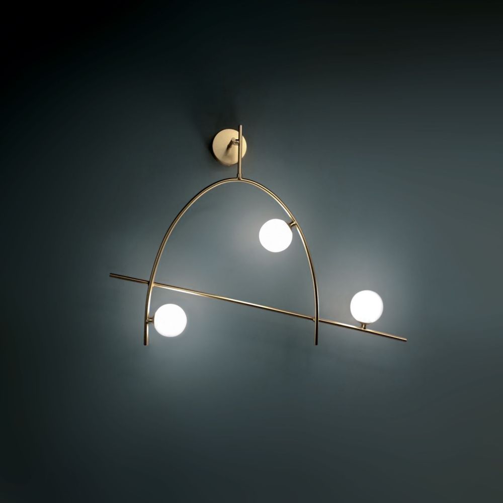 Applique da parete in acciaio e vetro con 3 sfere luminose a LED integrati (18W, 3000K, 720 lumen). Design moderno e scultoreo che dona un tocco sofisticato alla parete. Disponibile in finitura oro.