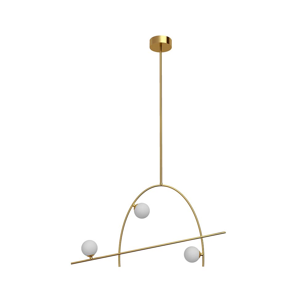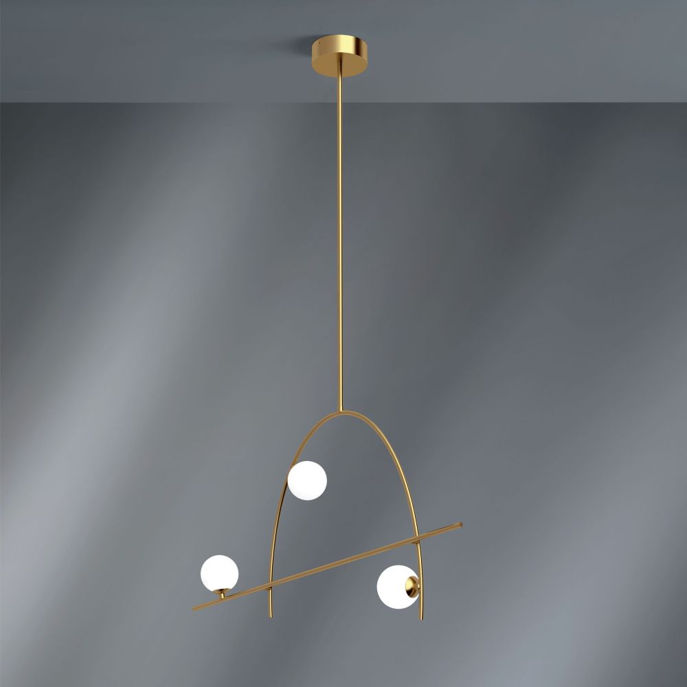 Lampada a sospensione moderna in acciaio e vetro, con 3 sfere luminose a LED integrati (18W, 3000K, 720 lumen) che diffondono luce calda a 3000K.