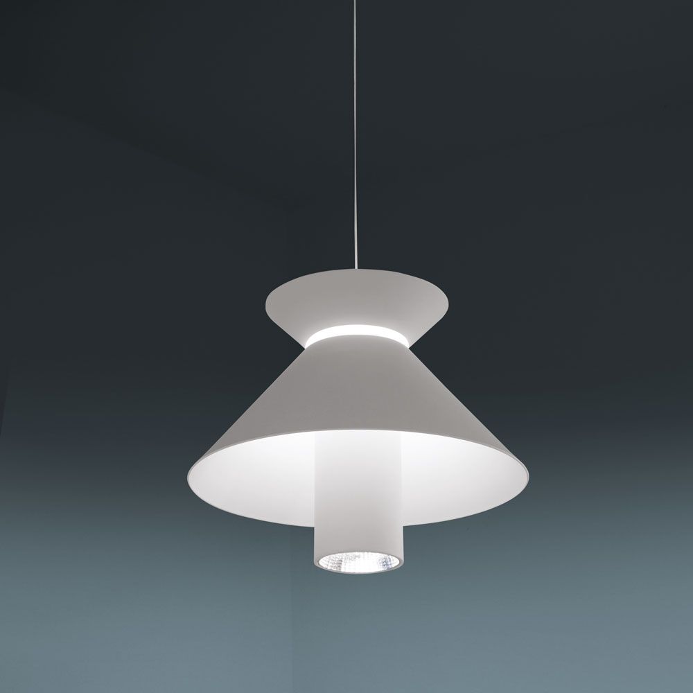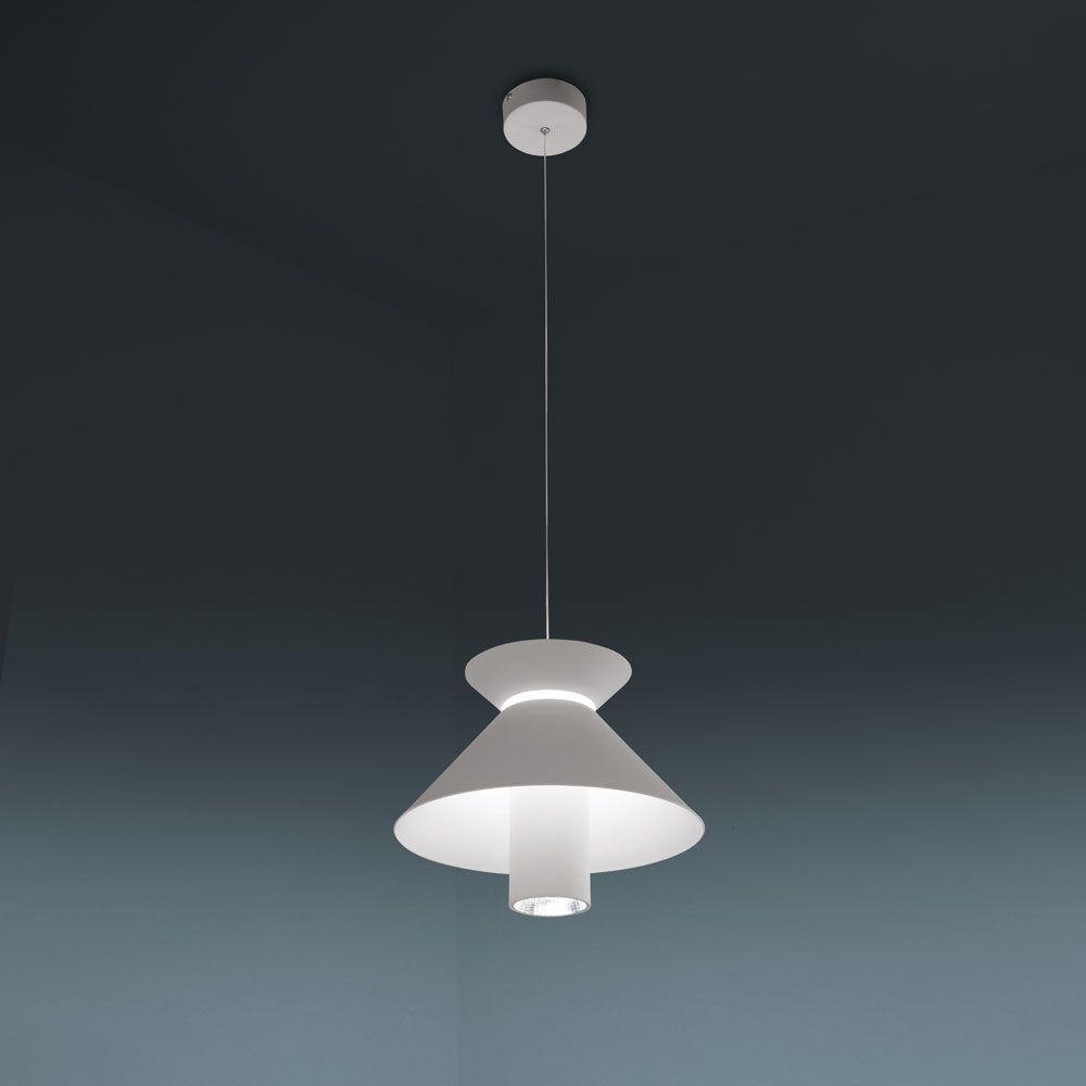 Lampada a sospensione in alluminio dal design moderno e nordico, con LED integrati da 30W 3000K. Disponibile in bianco, nero e bronzo.