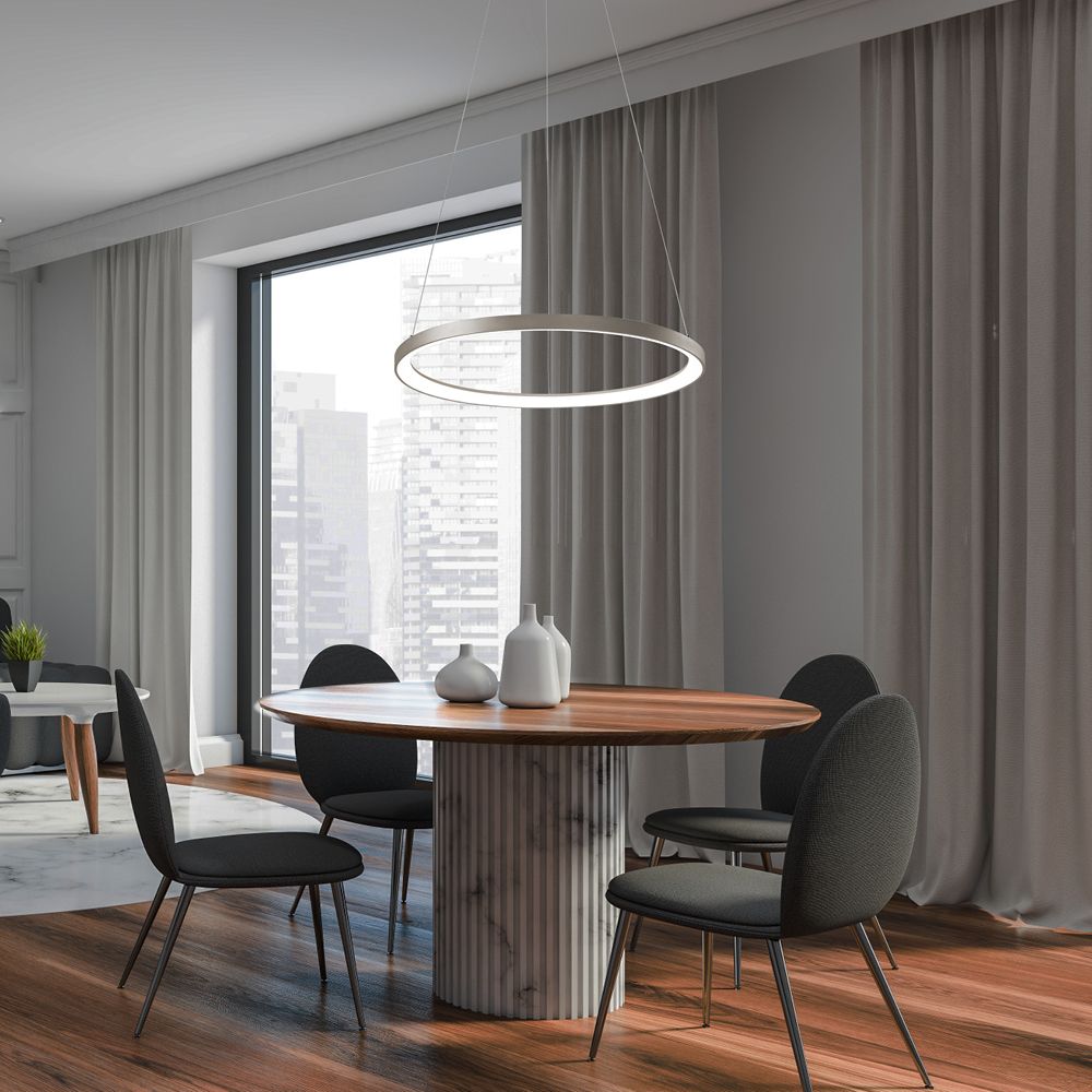 Vivida LiferIng Rotonda da 58 cm è una sospensione moderna ed elegante che porta leggerezza e design contemporaneo in qualsiasi ambiente. La sua struttura in alluminio forma un anello luminoso sospeso, ideale per illuminare con stile soggiorni, sale da pranzo o spazi professionali.