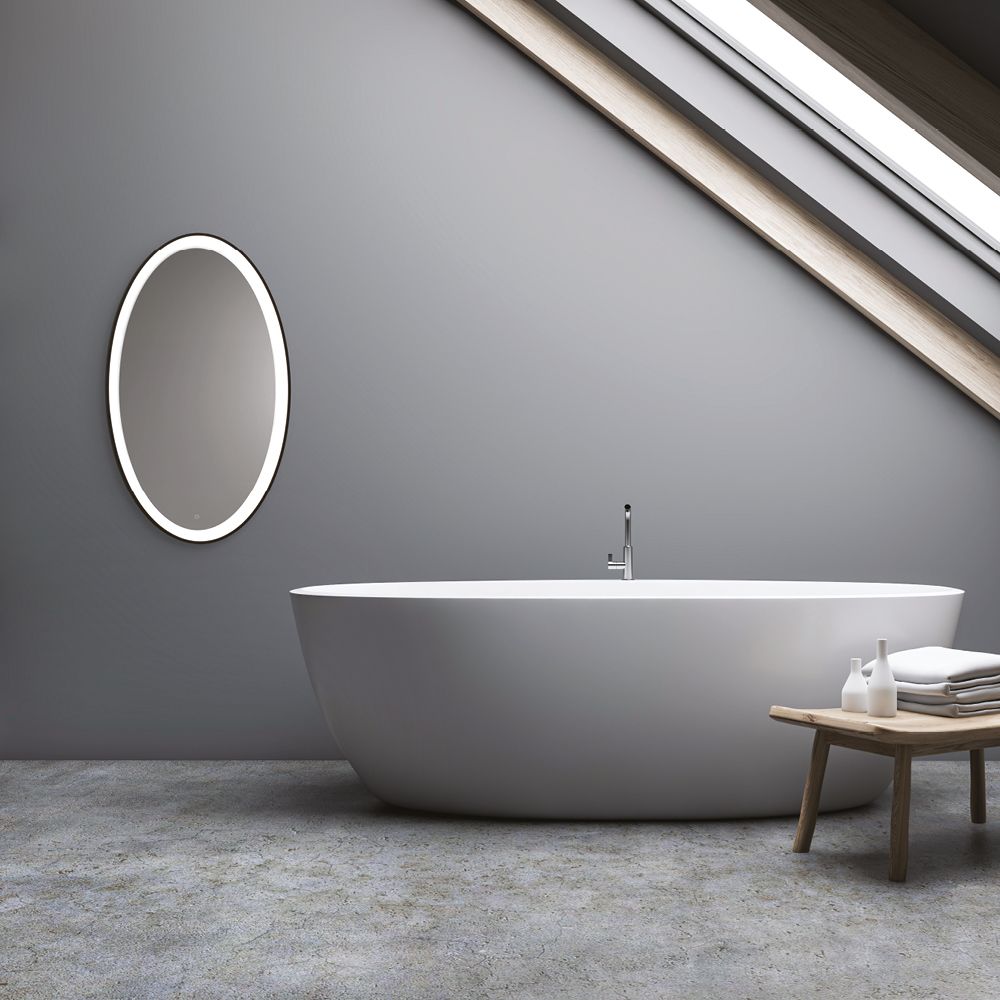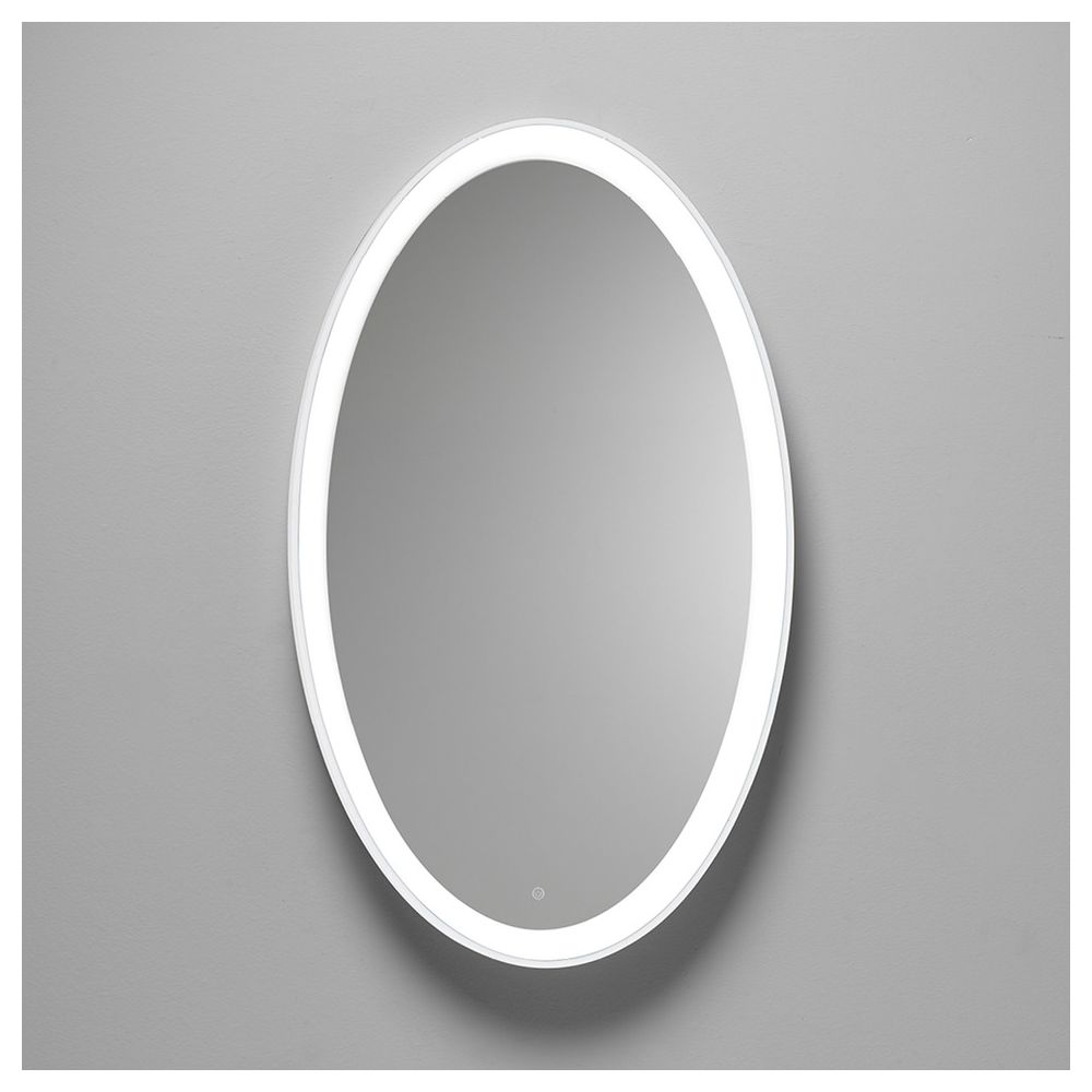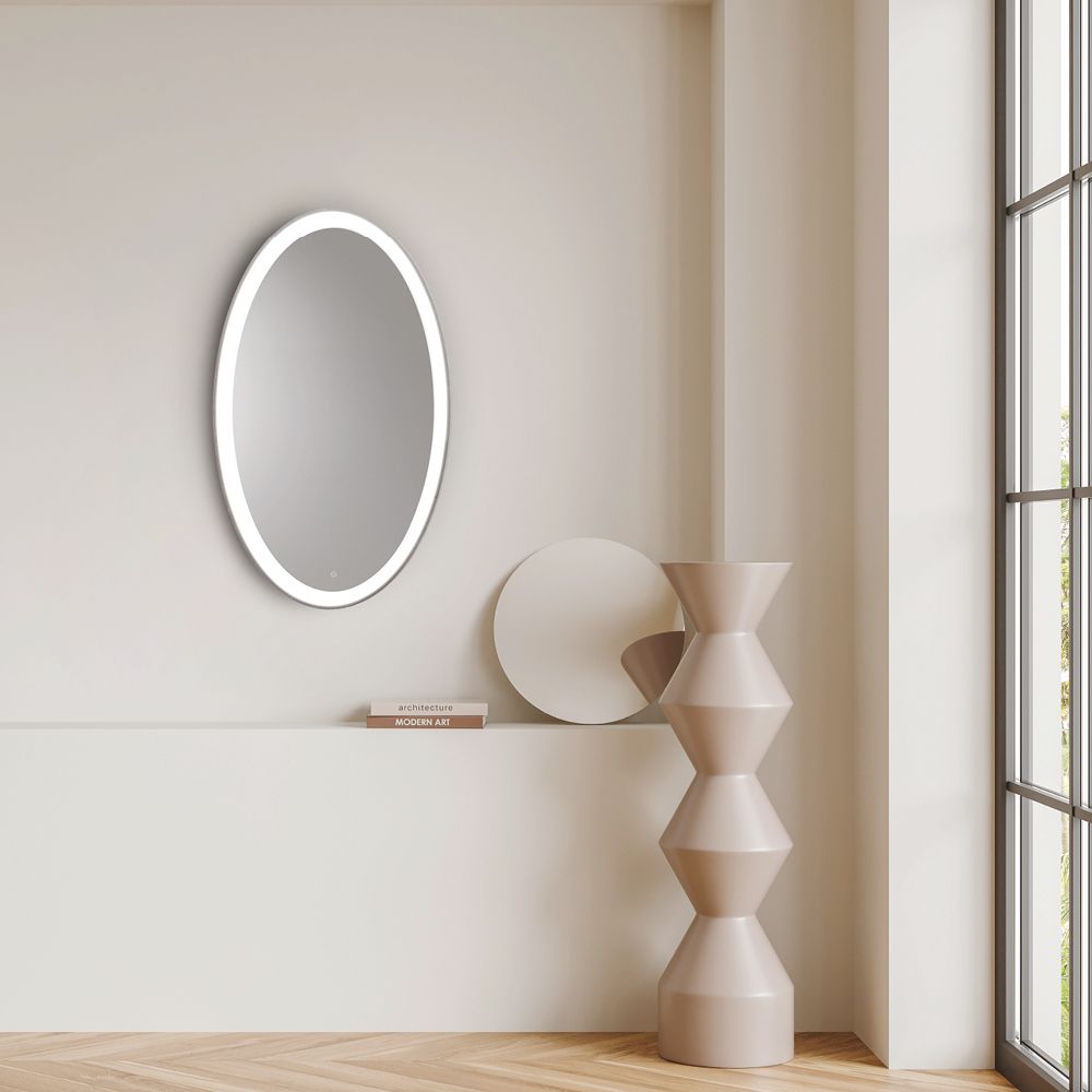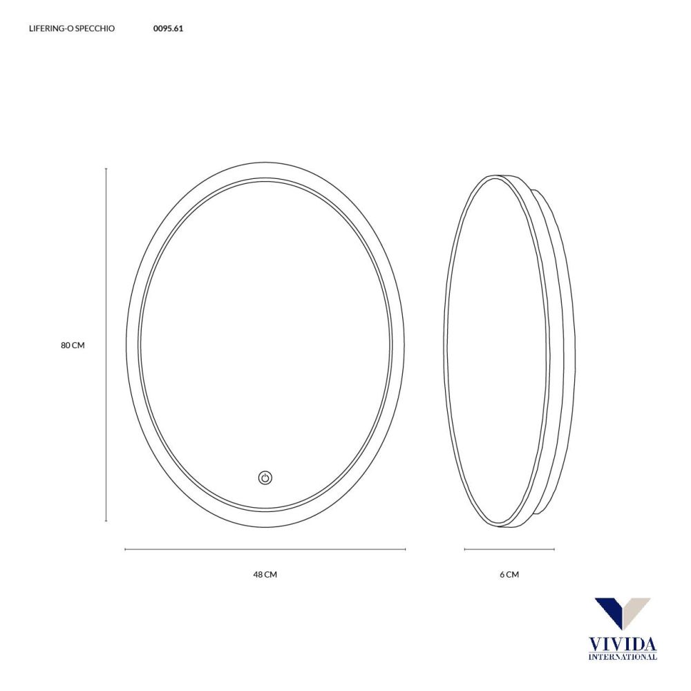 Vivida LIFERING Ovale Mirror 80 cm. Applique LED con cornice luminosa da 28W e 1900 lumen. Luce diffusa 3000K, design moderno in alluminio, acrilico e specchio. Misure 80x60 cm, sporgenza 4,8 cm. Colori: bianco, bronzo, sabbia, titanio, nero. Interruttore touch sullo specchio.